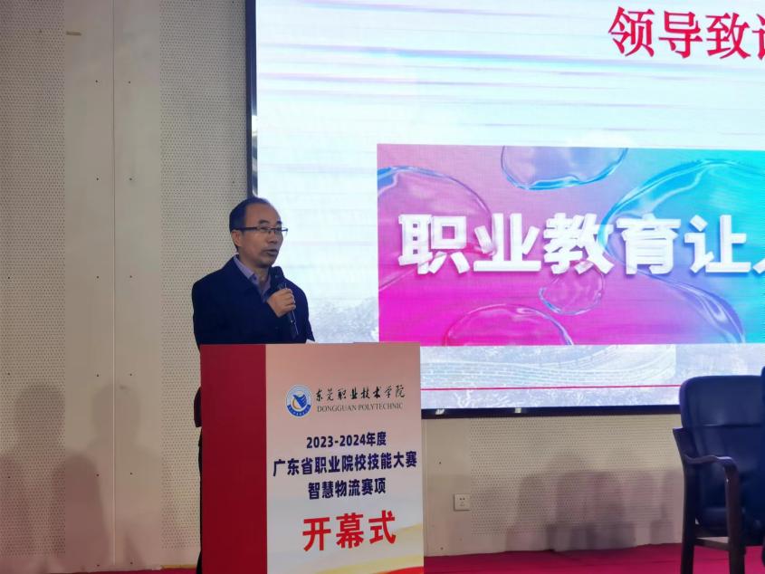 由广东省教育厅主办,我校承办的2023-2024年度广东省职业院校技能大赛智慧物流赛项于2024年1月15日-17日在我校举行。开幕式于2024年1月15日在我校图书馆学术报告厅拉开帷幕。我校党委副书记、校长贺定修,商贸学院党总支书记、院长颜汉军,省教育厅督察、广州番禺职业技术学院教务处副处长曾哲军,深圳市中诺思科技股份有限公司副总经理代丽梅出席开幕式。
