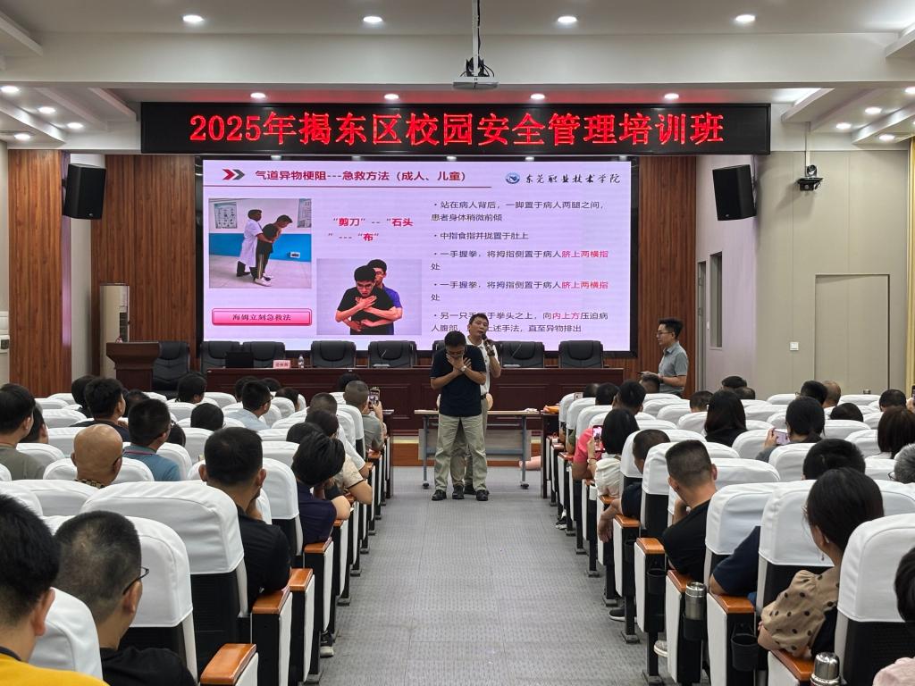 为推动我校“双百行动”走深走实,切实提升揭阳市揭东区校园安全管理水平,6月24日下午,我校卫生健康学院闫勇和姜林辉两名党员老师化身“安全卫士”送教上门。他们来到揭东区教师发展中心,为当地180名校园安全及食品安全管理相关人员主讲题为“2025年揭东区校园安全管理培训——第四场防溺水安全专场”的专题培训。
