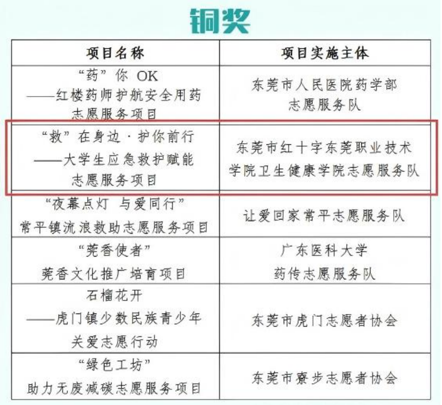 近日,由团市委、市委社会工作部等17个部门联合主办,以“助力‘百千万’青春志愿行”为主题的2025年“益苗计划”东莞志愿服务项目大赛圆满落幕。本次大赛旨在推动东莞志愿服务事业高质量发展,大力培育发展特色志愿服务项目。我校卫生健康学院张巍、姜林辉、卢俏茵三位老师指导的“‘救’在身边·护你前行——大学生应急救护赋能志愿服务项目”凭借扎实的工作基础、专业的团队结构以及创新的服务模式,在全市212个申报项目中脱颖而出,荣获培育发展项目铜奖。